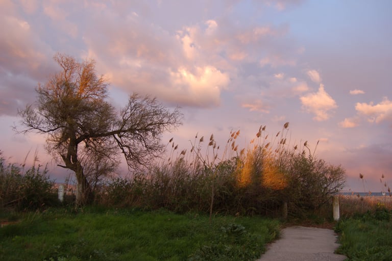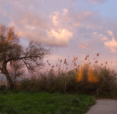 Monet captura una escena bucólica al atardecer, donde la luz cálida acaricia un paisaje natural con un árbol solitario y un tobogán infantil.